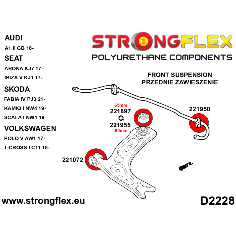 *Érvényes: Audi A1 GB, Seat Arona KJ7, Seat Ibiza KJ1, Skoda Fabia PJ3, Skoda Kamiq NW4, Skoda Scala NW1, VW Polo AW1, VW T-Cross C11 persely 221950 illik az első stabilizátorhoz OEM számokkal 3QN341,1130341 2QN301M.A termék rendelése előtt mérés szükséges!